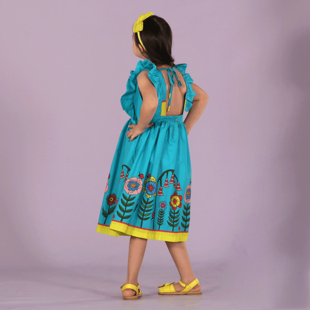 Vestido com babados nas mangas e decote nas costas com cordão para ajustar.